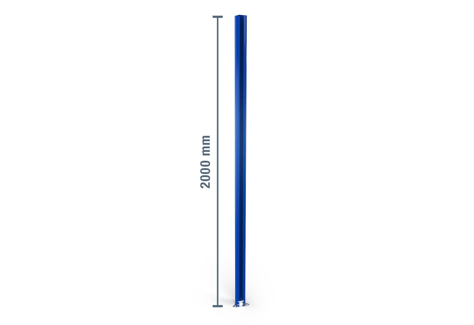 Perfil de soporte angular para estantería de almacén LR2000 de acero laminado en frío con una altura de 2 m. La carga por campo (carga máxima entre dos soportes de estantería de almacén) es de 2.000 kg. El recubrimiento en polvo de color azul protege el material de forma duradera contra la corrosión. El perfil de soporte se fija firmemente al suelo con M8 x 55 mm pernos de anclaje, lo que garantiza la estabilidad de toda la estantería de almacén.