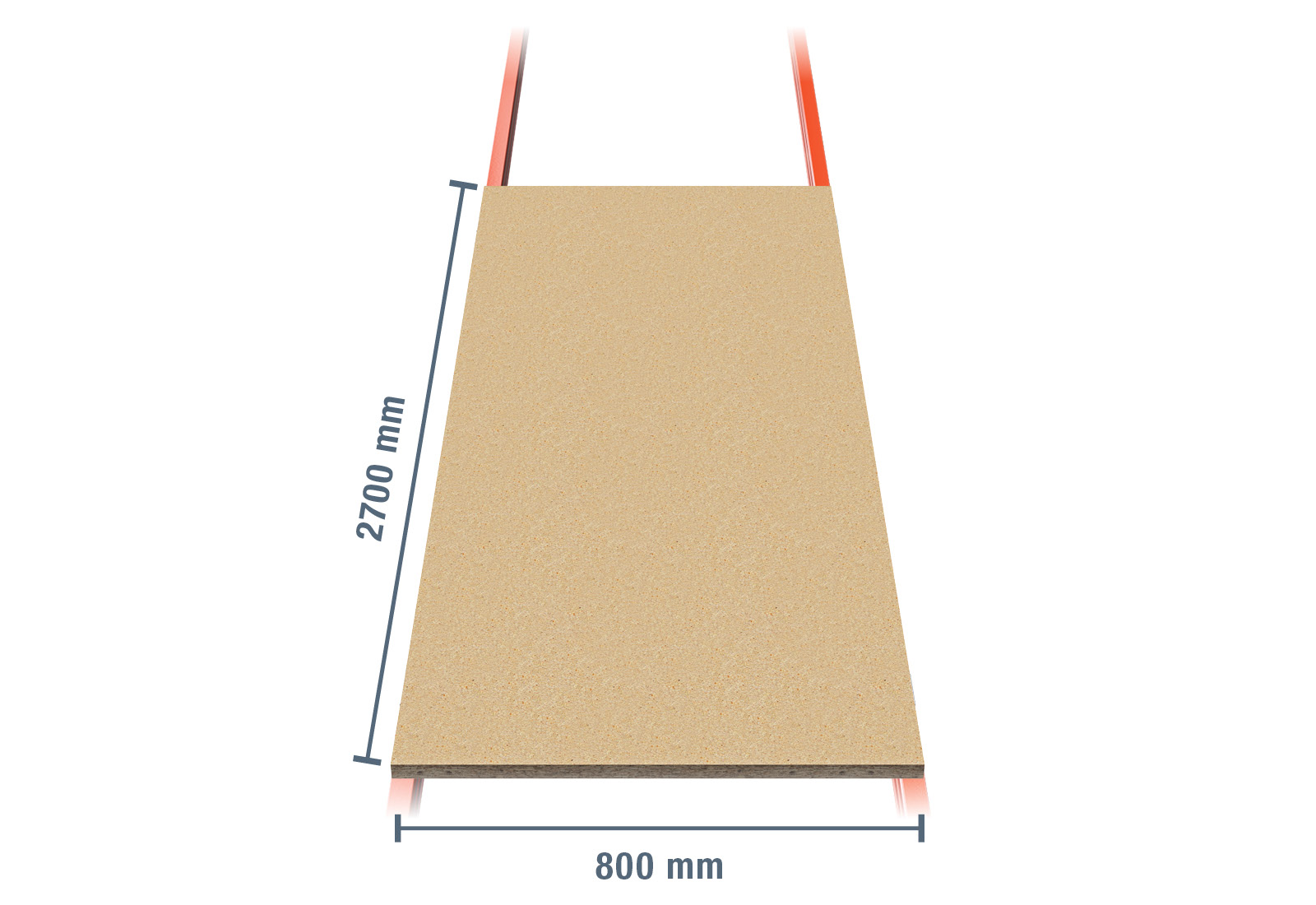 - 1 x 2.700 mm baldas de madera para estanterias para palets PR15000 / 800 mm profundidad / 38 mm espesor / 5 barras de profundidad