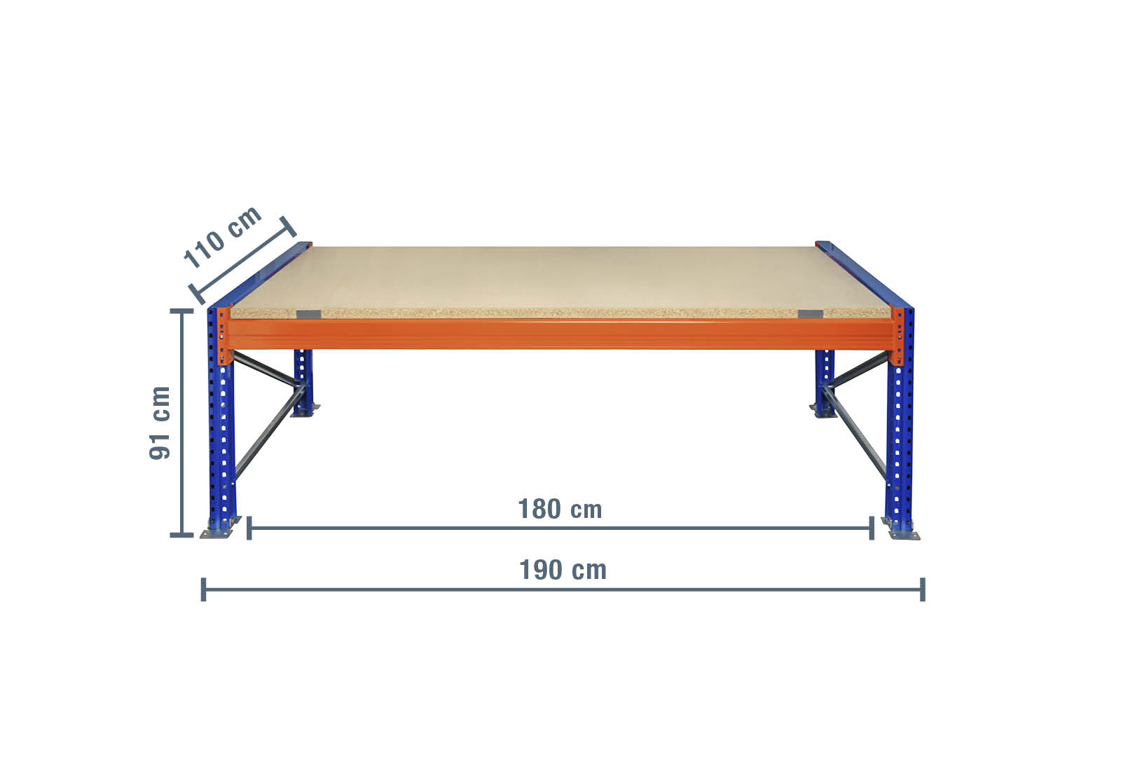 Esta mesa de embalaje, de dimensiones 1,9 m x 110 cm x 0,91 m, está equipada con 1 baldas de madera de estanterías para palés hechas a partir de un tablero de partículas en bruto. Esto permite el almacenamiento y procesamiento de productos secos. La balda de madera se puede colocar de forma segura sobre los travesaños pintados de naranja utilizando las placas en Z incluidas. Esta estructura evita que la balda se deslice y se caiga y se utiliza para garantizar la seguridad en el trabajo. Los niveles individuales se pueden colgar por separado en una cuadrícula de 50 mm. La superficie útil de balda de esta mesa de embalaje es de 180 cm.