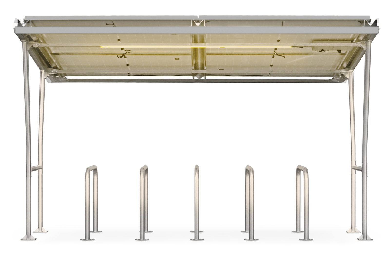 El aparcamiento para bicicletas F350/5-SL no solo protege las bicicletas y las bicicletas eléctricas del viento y las inclemencias del tiempo. Con los módulos solares 4, que se fijan a la estructura del techo del aparcamiento, se puede generar hasta 1,68 kWp de electricidad. La amplia superficie solar y la potente batería de 24 V / 25 Ah garantizan una energía suficiente incluso en días nublados o con una orientación desfavorable, de modo que la iluminación esté siempre lista para su uso. Cada módulo solar tiene una potencia máxima de 420 Wp. Los módulos solares también son impermeables: con un grado de protección de , incluso la toma de conexión es resistente a las salpicaduras. La elevada carga del techo, de hasta 80 kg/m², garantiza la seguridad del refugio incluso con fuertes nevadas.
