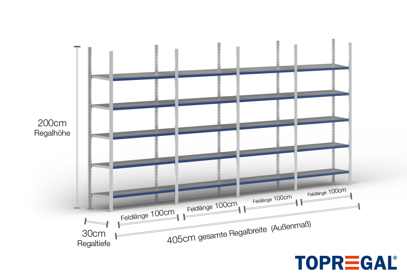 4 m estantería metálica FB200 / 30 cm profundidad / 2 m altura / 5 niveles / baldas acero / carga por balda 200 kg