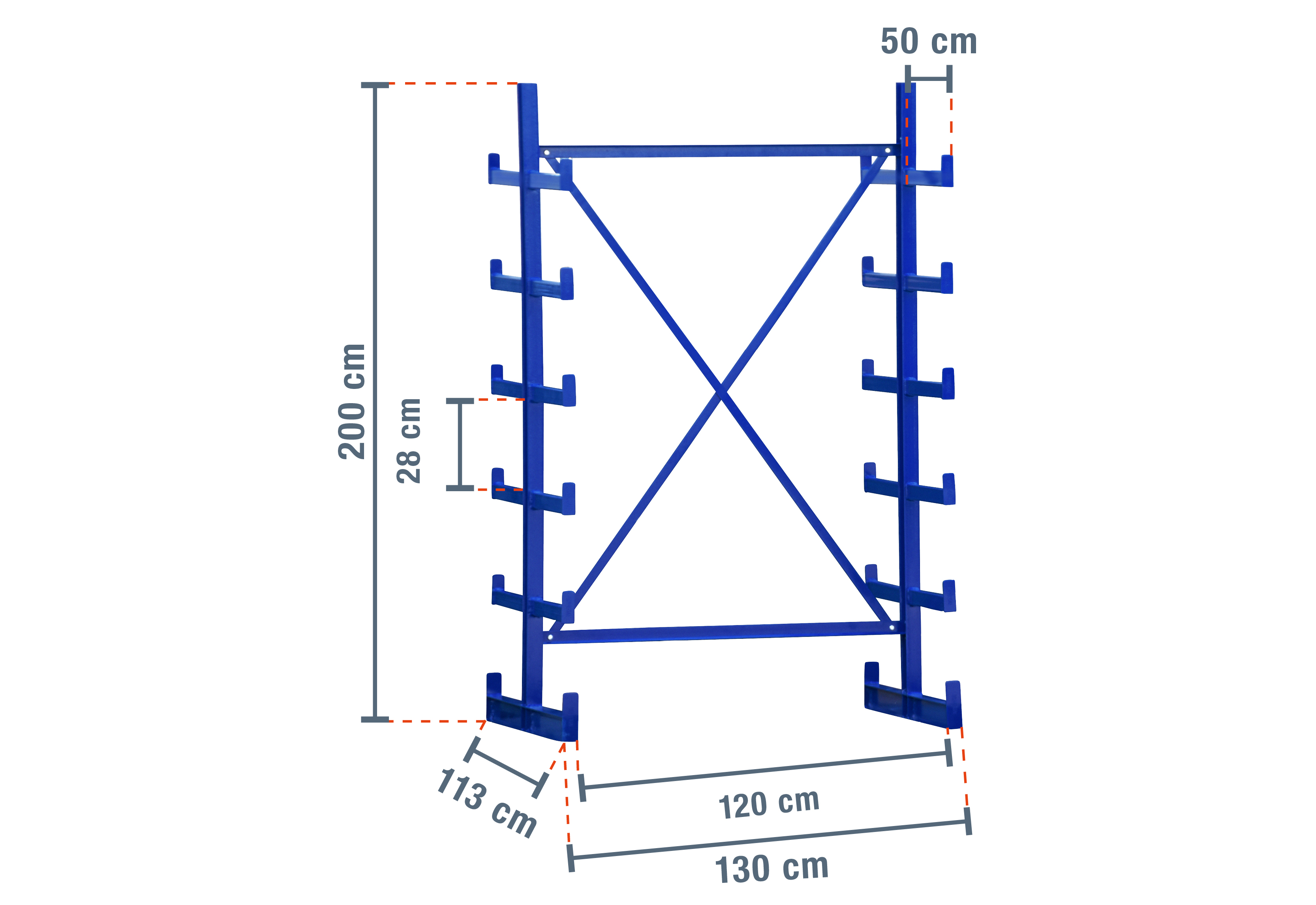 Esta estantería cantilever particularmente robusta con una anchura de 1,3 m, tiene una altura de 2 m y 5 niveles con una profundidad de brazo de 50 cm. Gracias al modelo de dos lados con brazos cantilever ya soldados, puede cargar cada soporte con un máximo de 2.500 kg, teniendo cada brazo una carga máxima de 250 kg.