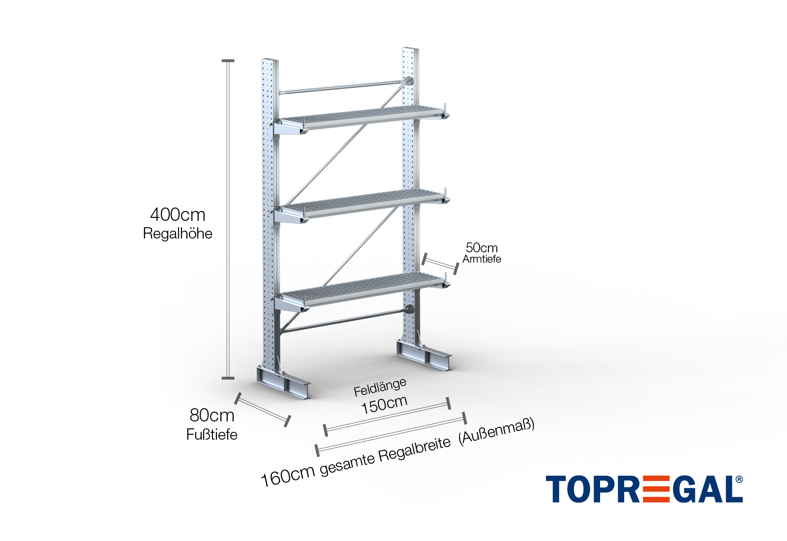 1,6 m estantería cantilever KR3000 / galvanizado en caliente / unilateral / 4 m altura / 50 cm cantilever profundidad / 3 niveles / balda rejilla
