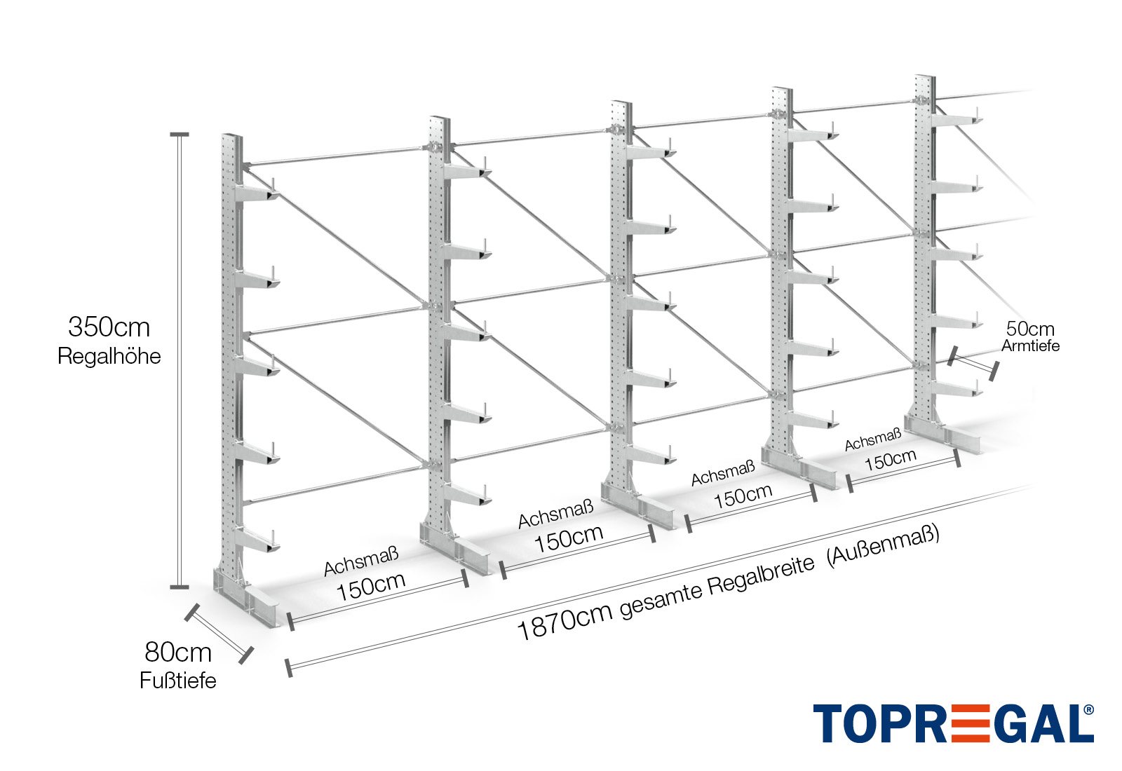 - 1 x campo de estantería cantilever (puntales) para 3,5 m de altura, dimensión del eje 1 m (tipo: KR3000 galvanizado)