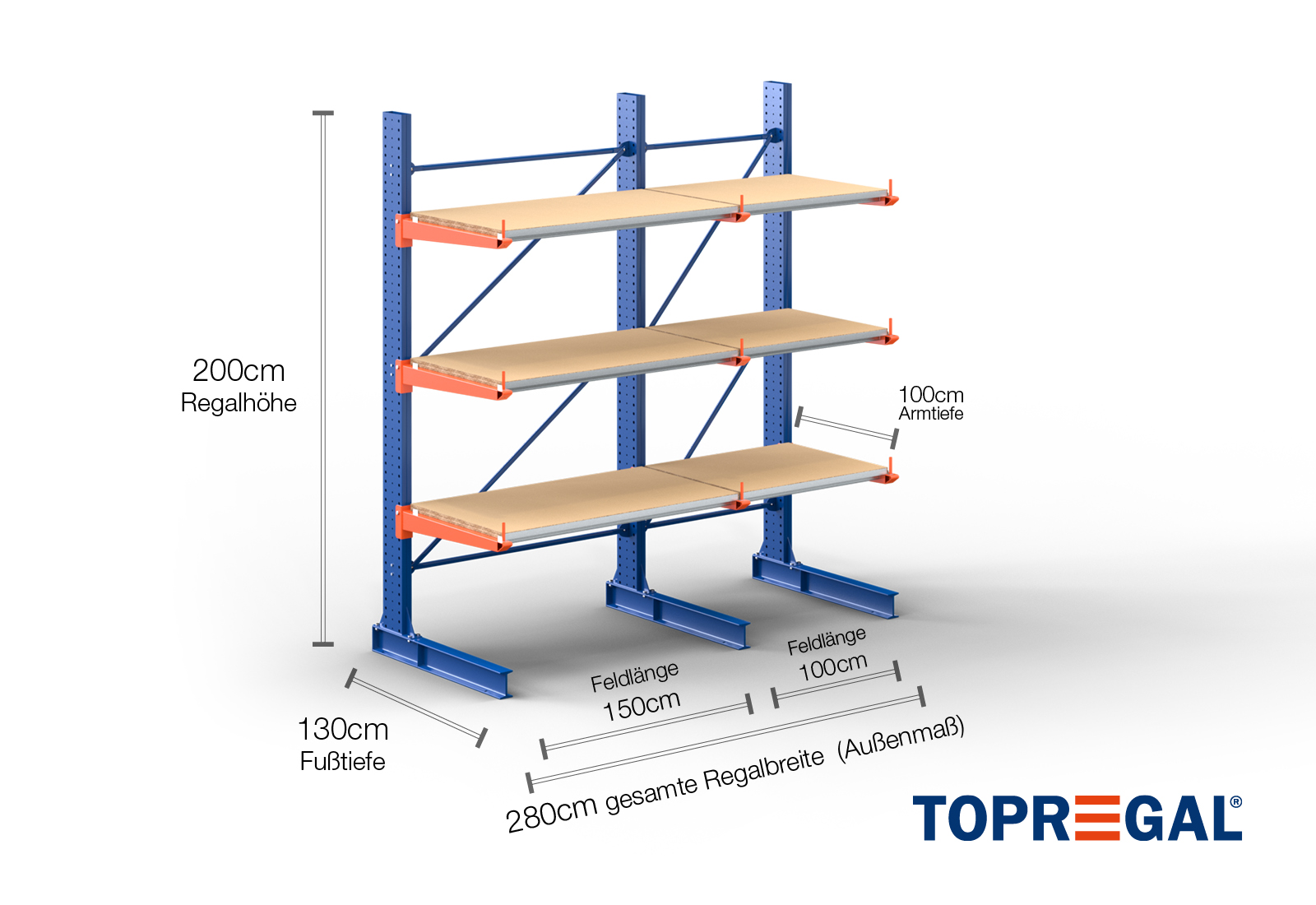 - 3 x brazo cantilever de balda de madera de 150 cm de anchura / 1.000 mm de profundidad, carga 400 kg