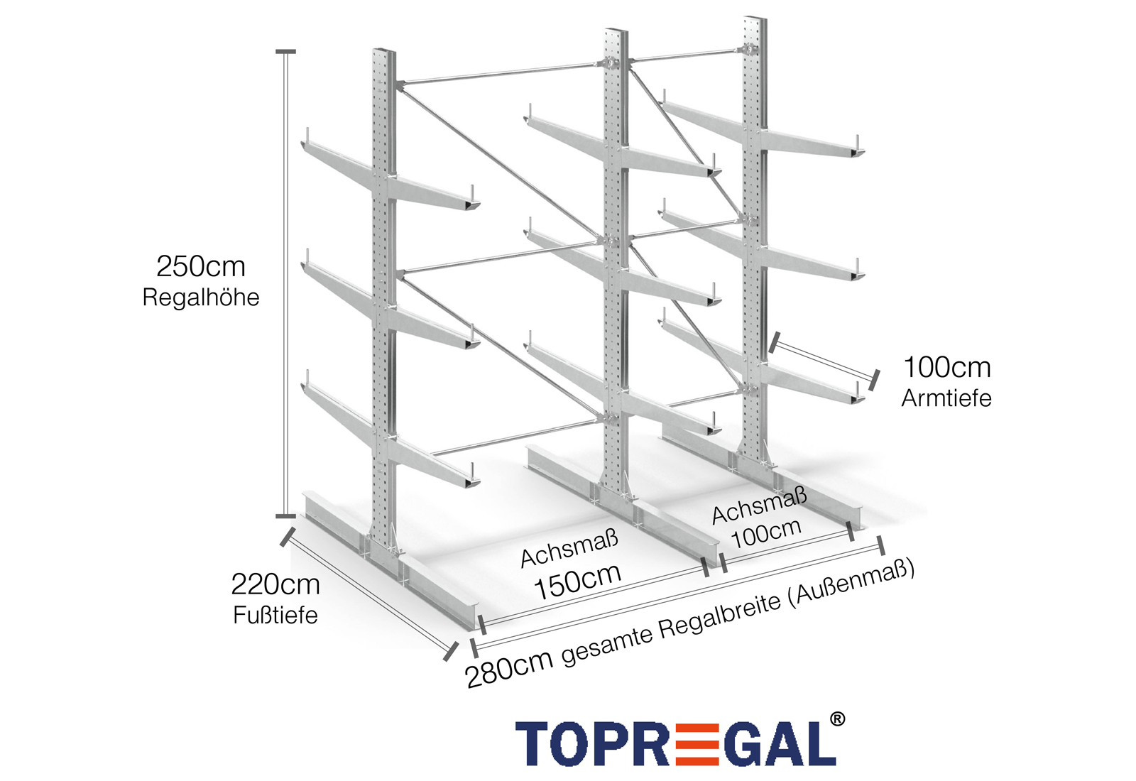 Esta estantería cantilever de dos lados mide 2,8 m de ancho por 2,5 m de alto, tiene una profundidad total de 220 cm y tiene 3 niveles de cantilever, con una profundidad de brazo de 100 cm. La carga máxima por brazo es de 500 kg. Los brazos cantilever se pueden colgar individualmente en una dimensión de cuadrícula de 50 mm y se aseguran con pernos y pasadores de seguridad. Los pies también se pueden utilizar (dependiendo de la mercancía) como nivel de almacenamiento. Para proteger la carga de deslizamientos accidentales, se puede insertar una protección contra rodaduras al final de cada brazo cantilever. Esto está incluido de serie en el volumen de suministro.