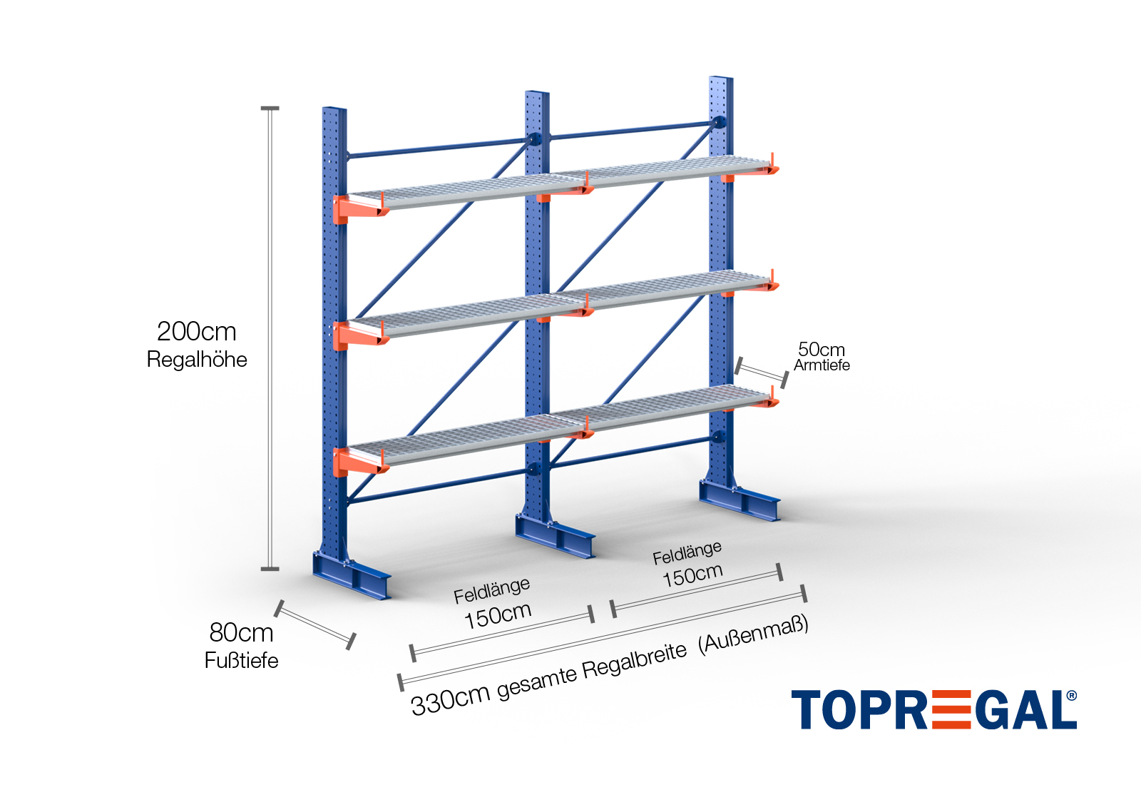 Esta estantería cantilever de un solo lado mide 3,3 m de ancho por 2 m de alto, tiene una profundidad total de 80 cm y tiene 3 niveles de cantilever, con una profundidad de brazo de 50 cm. La carga máxima por brazo es de 500 kg. Los brazos cantilever se pueden colgar individualmente en una dimensión de cuadrícula de 50 mm y se aseguran con pernos y pasadores de seguridad. Los pies también se pueden utilizar (dependiendo de la mercancía) como nivel de almacenamiento. Para proteger la carga de deslizamientos accidentales, se puede insertar una protección contra rodaduras al final de cada brazo cantilever. Esto está incluido de serie en el volumen de suministro.