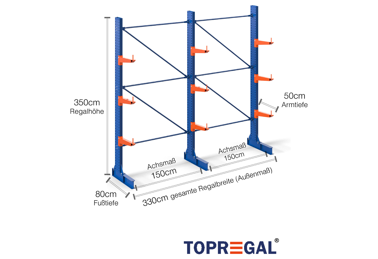 La dimensión del eje es la dimensión interna entre dos montantes de la estantería. Dependiendo del tipo de voladizo, ofrecemos estas bahías en 120 cm (KR2500) y en 100 cm / 150 cm (KR3000 / KR6000).
