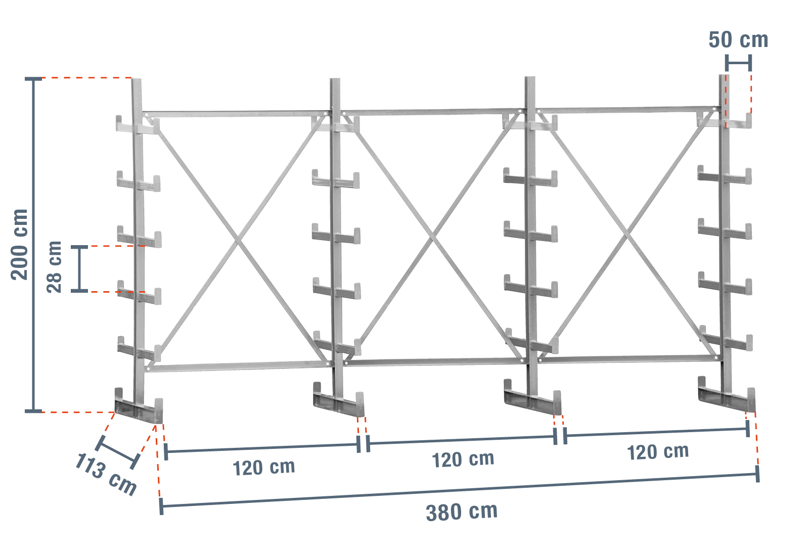 Los soportes individuales se atornillan entre sí mediante 2 travesaños transversales y diagonales (distancia entre ejes 1.200 mm). Cada brazo en voladizo tiene una anchura de apoyo de 30 mm y está provisto de un dispositivo antideslizamiento de 50 mm de altura. La parte inferior, de 50 cm de largo, tiene una profundidad de apoyo de 50 cm, una anchura de apoyo de 50 mm y un dispositivo antideslizamiento de 70 mm de altura. De este modo, las partes inferiores también pueden utilizarse como nivel de almacenamiento.