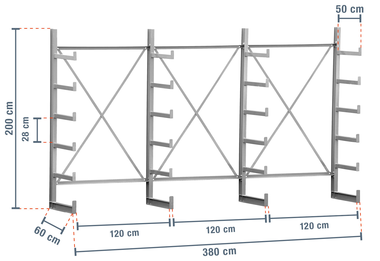 Los brazos en voladizo profundos 50 cm con acabado galvanizado en caliente son ideales para almacenar productos largos.