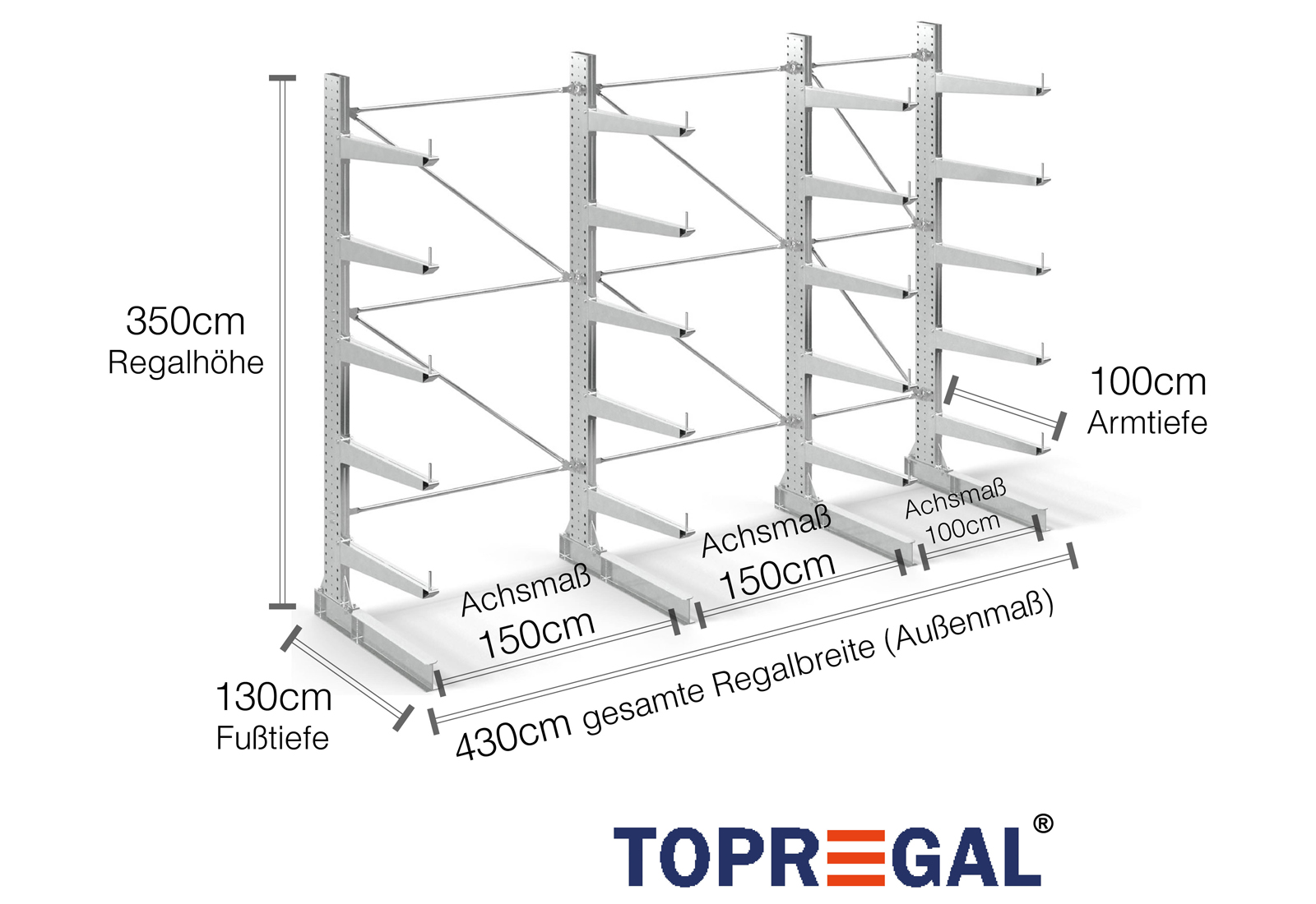 4,3 m estantería cantilever KR3000 / galvanizado en caliente / unilateral / 3,5 m altura / 100 cm cantilever profundidad / 5 niveles