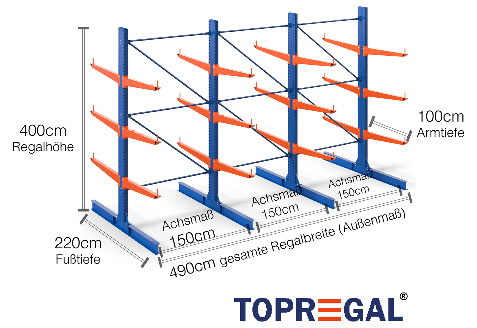 4,9 m estantería cantilever KR3000 / barnizado / bilateral / 4 m altura / 100 cm cantilever profundidad / 3 niveles