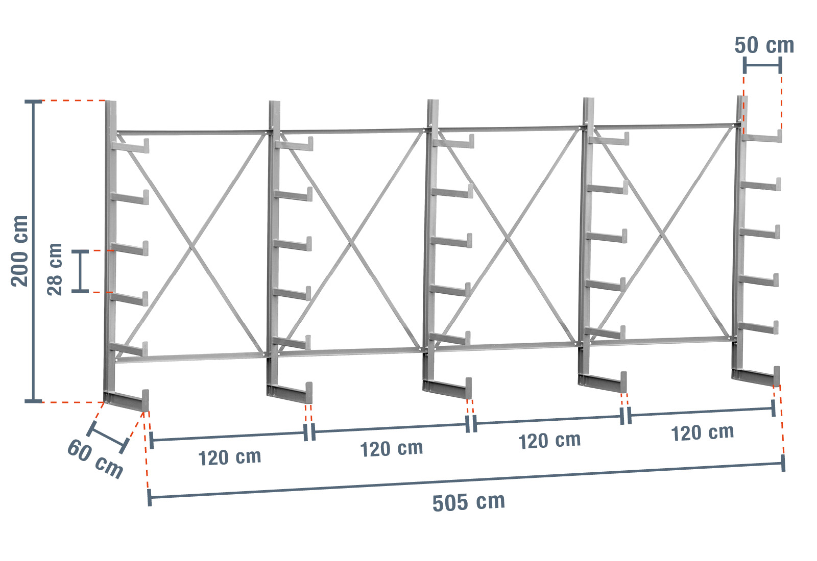 Los brazos en voladizo profundos 50 cm con acabado galvanizado en caliente son ideales para almacenar productos largos.