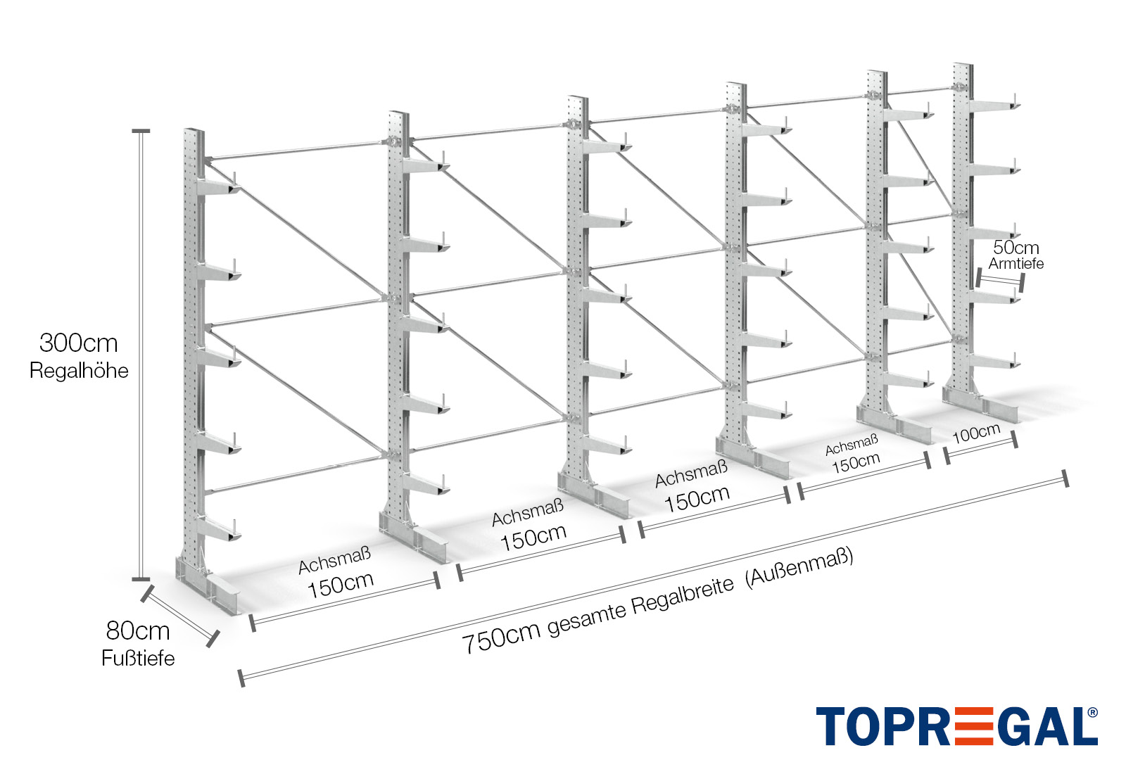 7,5 m estantería cantilever KR3000 / galvanizado en caliente / unilateral / 3 m altura / 50 cm cantilever profundidad / 5 niveles