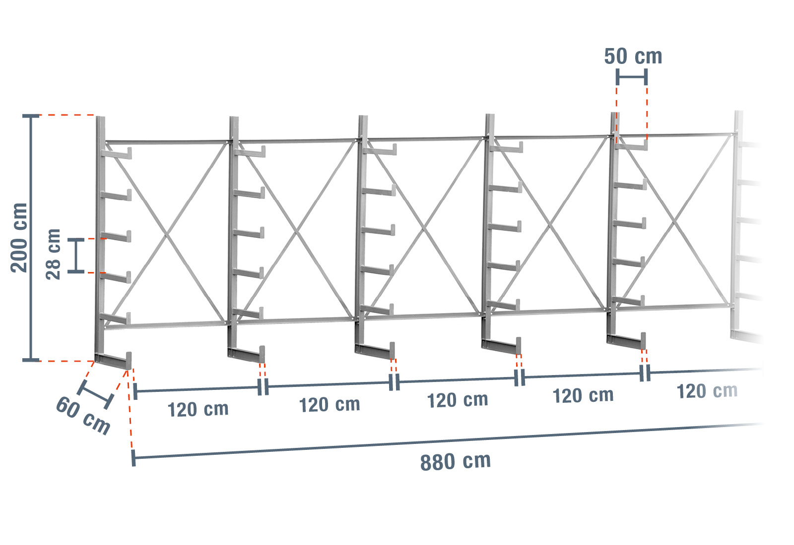 Los brazos en voladizo profundos 50 cm con acabado galvanizado en caliente son ideales para almacenar productos largos.