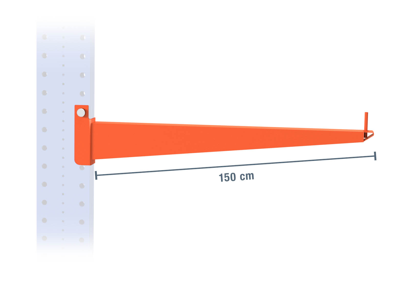 Este brazo está recubierto en polvo de color de señalización naranja y se puede cargar con un máximo de 1.000 kg. Esto lo hace especialmente adecuado para su uso en interiores secos, como, por ejemplo, en almacenes. Para montar un campo de estantería completamente funcional, este brazo debe colgarse en los soportes de una estantería utilizando los accesorios suministrados.