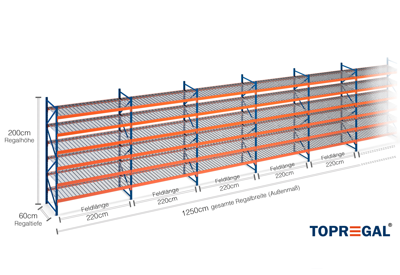 12,5 m estantería industrial LR2000 / 60 cm profundidad / 2 m altura /6 niveles / baldas rejilla