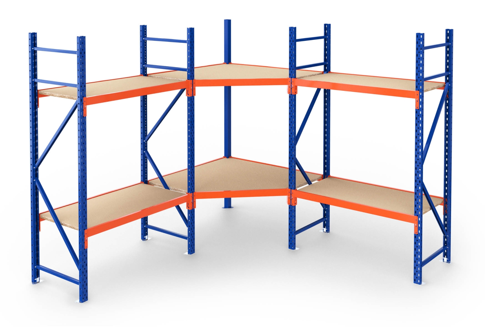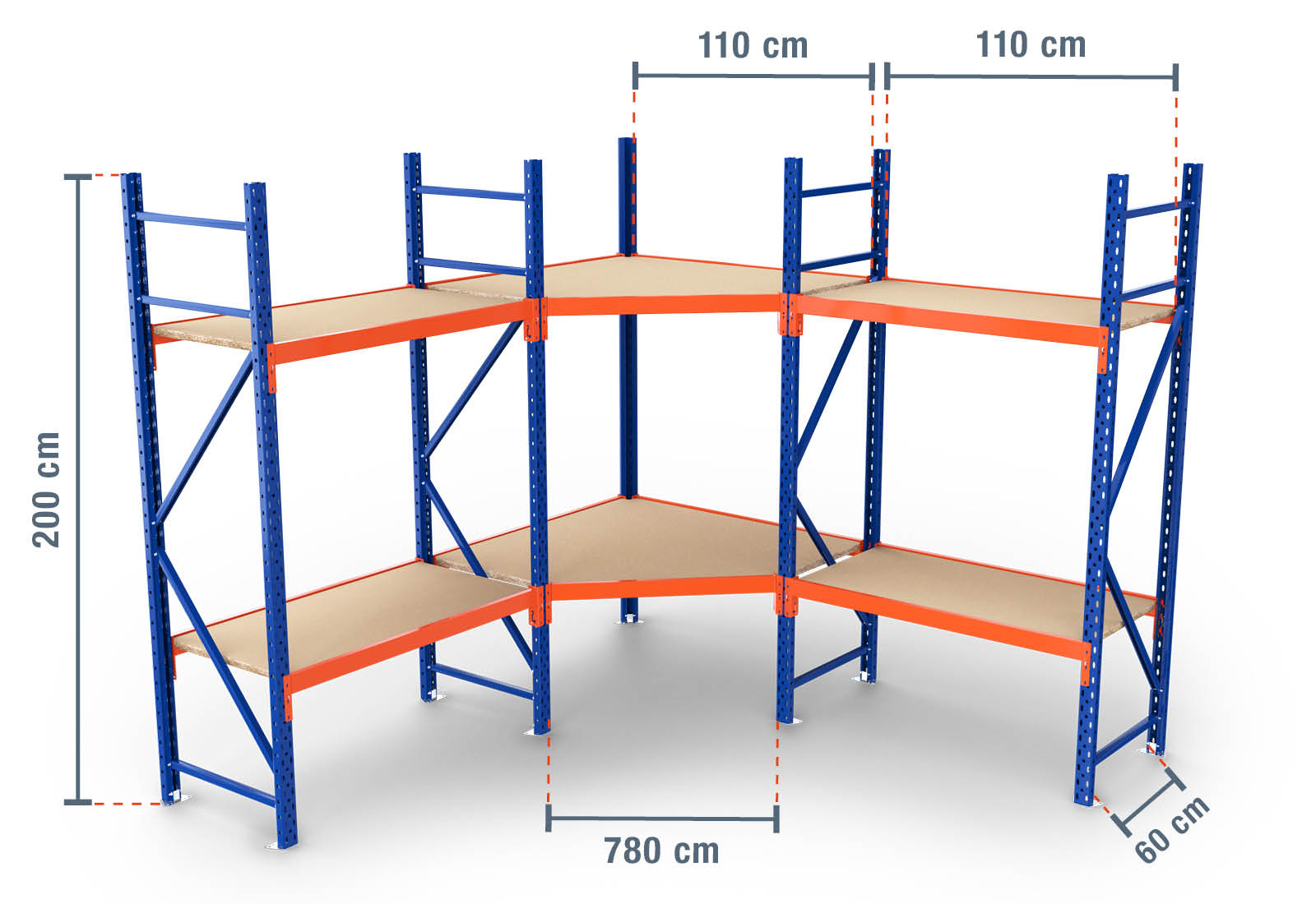 2.300 mm x 2.300 mm estantería angular / estantería industrial LR2000 / 60 cm profundidad / 2 m altura /2 niveles / baldas madera