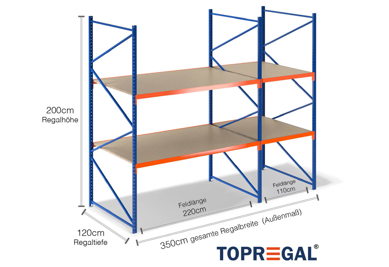 Este estante de almacenamiento destaca por su altura de 2 m, tiene 120 cm de profundidad y una anchura de 3,5 m. Cada uno de los 2 niveles ofrece una carga máxima de 500 kg, por lo que no se debe superar la carga máxima entre dos soportes (la carga de campo) de 2.000 kg. Esta información siempre se refiere a una carga uniforme en las estanterías. Gracias al sistema de empalme, el montaje es rápido y sencillo. También hay una amplia selección de piezas y accesorios individuales para las estanterías de grandes dimensiones de TOPREGAL, como soportes para estanterías, travesaños, bandas magnéticas y cajas con abertura frontal.