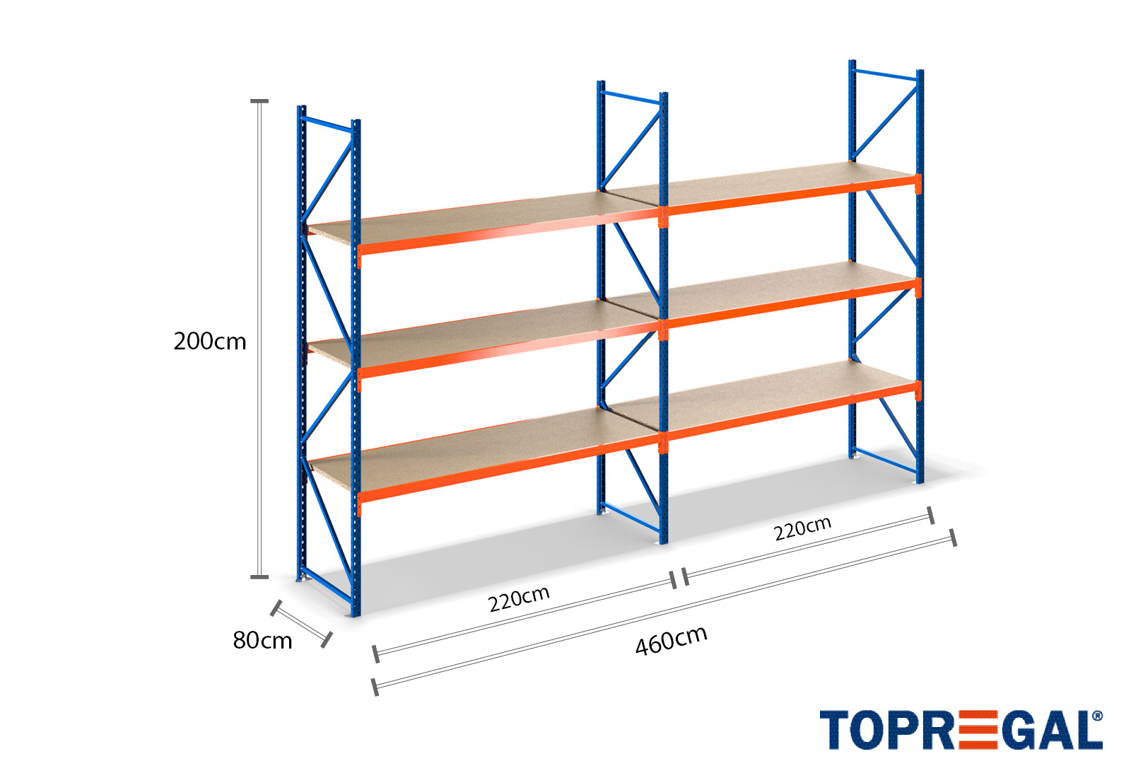 Este estante de almacenamiento destaca por su altura de 2 m, tiene 80 cm de profundidad y una anchura de 4,6 m. Cada uno de los 3 niveles ofrece una carga máxima de 500 kg, por lo que no se debe superar la carga máxima entre dos soportes (la carga de campo) de 2.000 kg. Esta información siempre se refiere a una carga uniforme en las estanterías. Gracias al sistema de empalme, el montaje es rápido y sencillo. También hay una amplia selección de piezas y accesorios individuales para las estanterías de grandes dimensiones de TOPREGAL, como soportes para estanterías, travesaños, bandas magnéticas y cajas con abertura frontal.