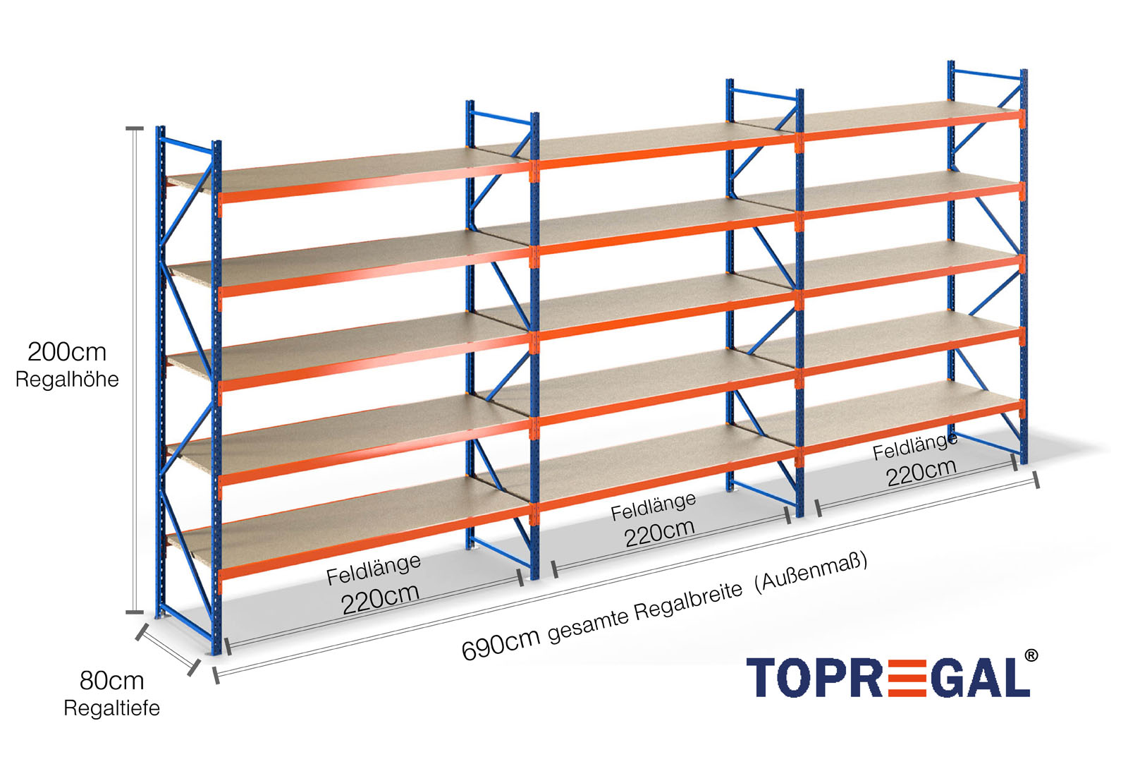 Gracias a su estabilidad y versatilidad, los estantes de almacenamiento de TOPREGAL cumplen con todos los requisitos. Nuestros estantes de grandes dimensiones convencen con una carga de campo (carga total con distribución uniforme entre dos soportes) de 2.000 kg y una carga por balda de 500 kg. Esto significa que puede guardar fácilmente diferentes mercancías de almacén, así como artículos voluminosos y pesados en ellos.