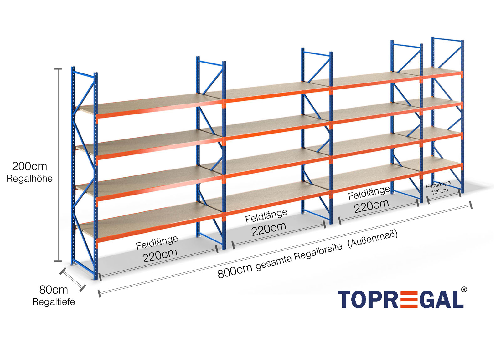 Este estante de almacenamiento destaca por su altura de 2 m, tiene 80 cm de profundidad y una anchura de 8,0 m. Cada uno de los 4 niveles ofrece una carga máxima de 500 kg, por lo que no se debe superar la carga máxima entre dos soportes (la carga de campo) de 2.000 kg. Esta información siempre se refiere a una carga uniforme en las estanterías. Gracias al sistema de empalme, el montaje es rápido y sencillo. También hay una amplia selección de piezas y accesorios individuales para las estanterías de grandes dimensiones de TOPREGAL, como soportes para estanterías, travesaños, bandas magnéticas y cajas con abertura frontal.