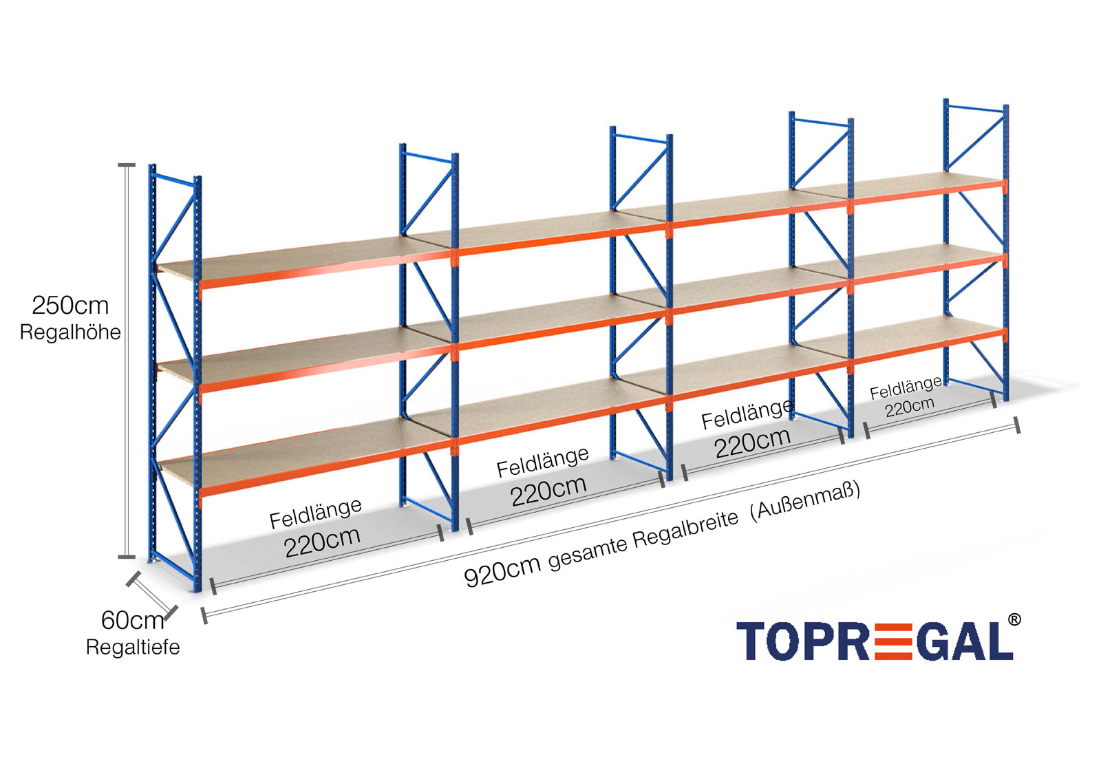 Todos los datos se refieren a cargas distribuidas uniformemente. Cuando esté cargado, no deben superarse la carga de estante ni la carga de campo. En principio, durante el uso se aplican las directrices vigentes sobre seguridad y salud en el trabajo (Norma alemana DGUV 208-061). TOPREGAL no asume ninguna responsabilidad por accidentes/daños causados por un uso inadecuado. Nuestro equipo de expertos asesores estará encantado de responder a sus preguntas. Las medidas indicadas son aproximadas y pueden variar en algunos centímetros. Póngase en contacto con nosotros si necesita las dimensiones exactas del producto que desea.
