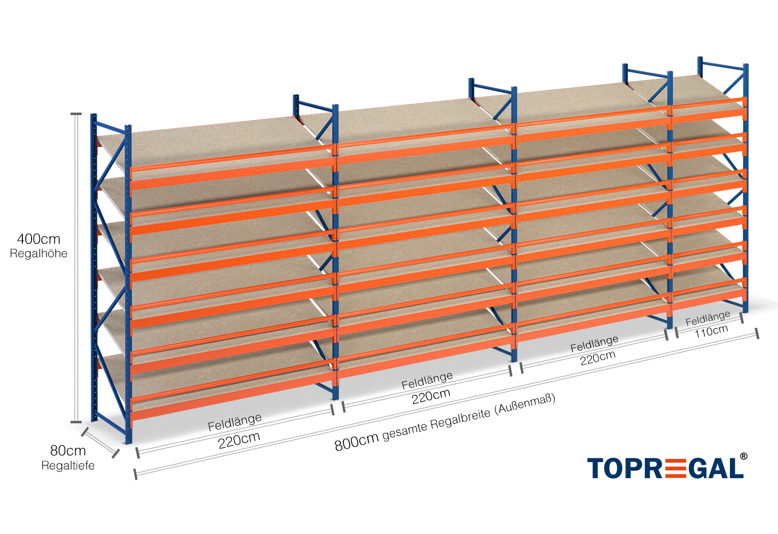 Todos los datos se refieren a cargas distribuidas uniformemente. Cuando esté cargado, no deben superarse la carga de estante ni la carga de campo. En principio, durante el uso se aplican las directrices vigentes sobre seguridad y salud en el trabajo (Norma alemana DGUV 208-061). TOPREGAL no asume ninguna responsabilidad por accidentes/daños causados por un uso inadecuado. Nuestro equipo de expertos asesores estará encantado de responder a sus preguntas. Las medidas indicadas son aproximadas y pueden variar en algunos centímetros. Póngase en contacto con nosotros si necesita las dimensiones exactas del producto que desea.