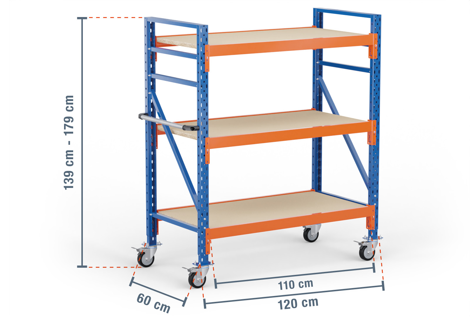 1,2 m estante de almacenamiento con ruedas LR2000 / 60 cm profundidad / 1.390 - 1.790 mm altura / 3 niveles / baldas madera