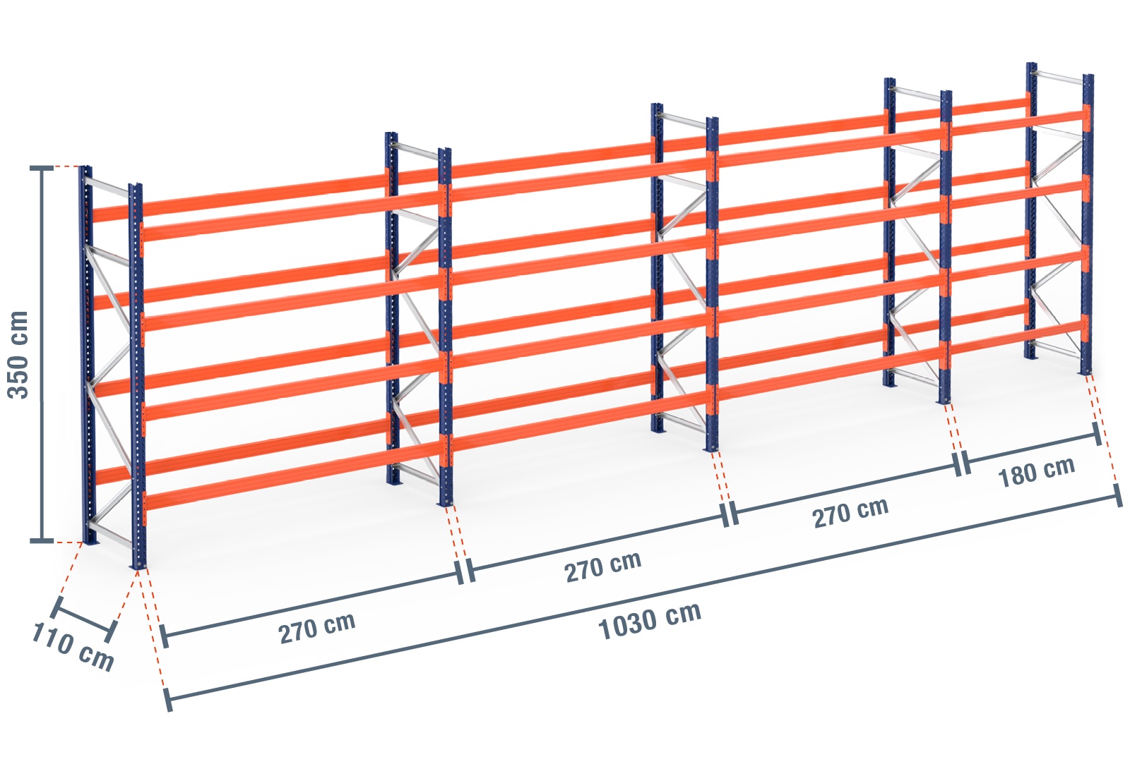 10,3 m estantería para palet PR9000 / 110 cm profundidad / 3,5 m altura / 4 estantes para 55 europalés