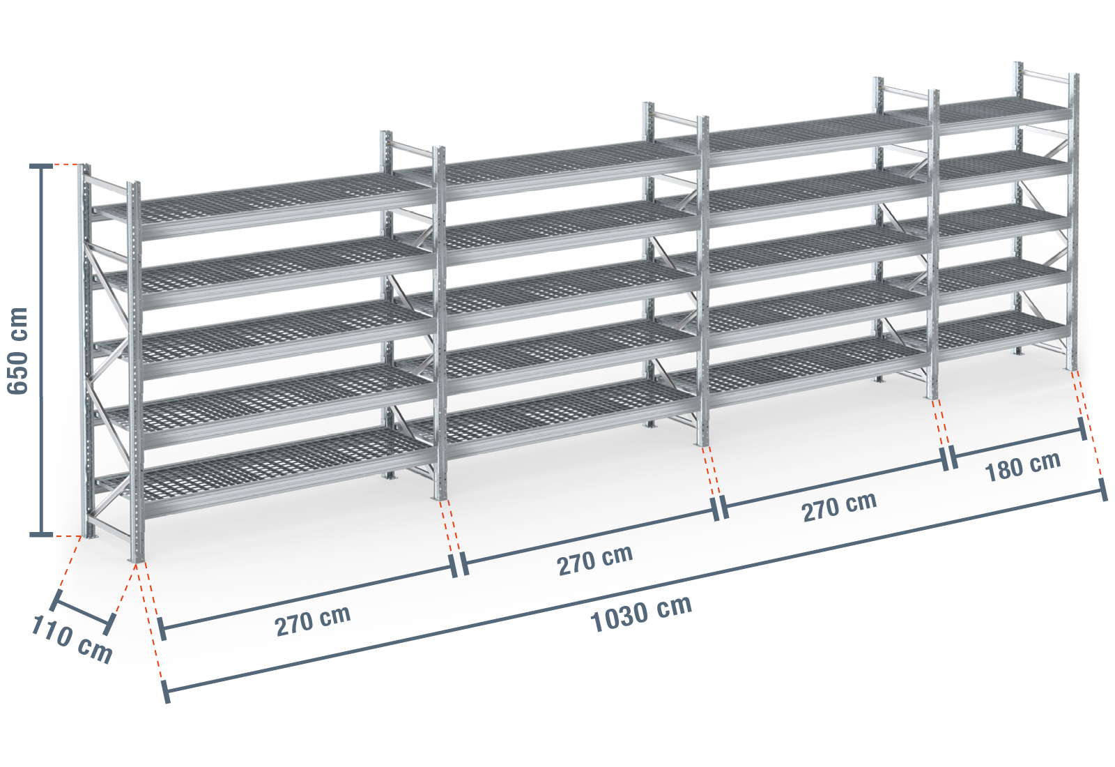 10,3 m estantería para palet PR9000F / 110 cm profundidad / 6,5 m altura / 5 niveles / baldas rejilla