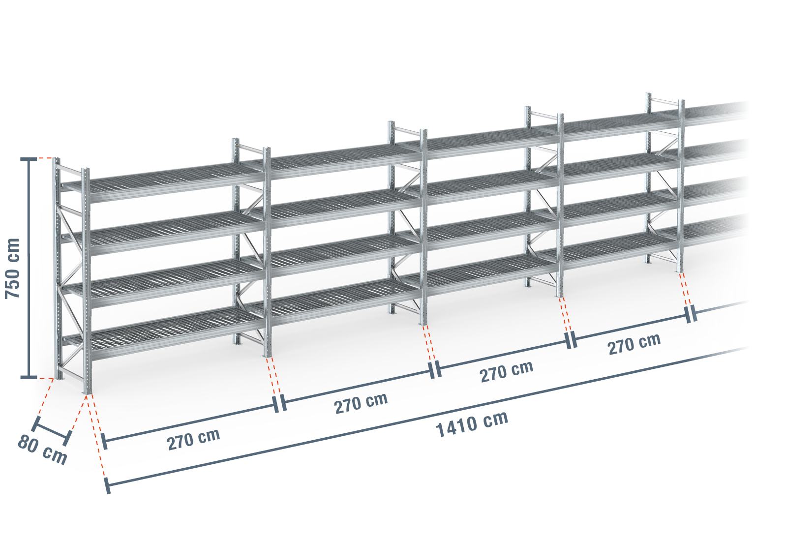14,1 m estantería para palet PR9000F / 80 cm profundidad / 7,5 m altura / 4 niveles / baldas rejilla