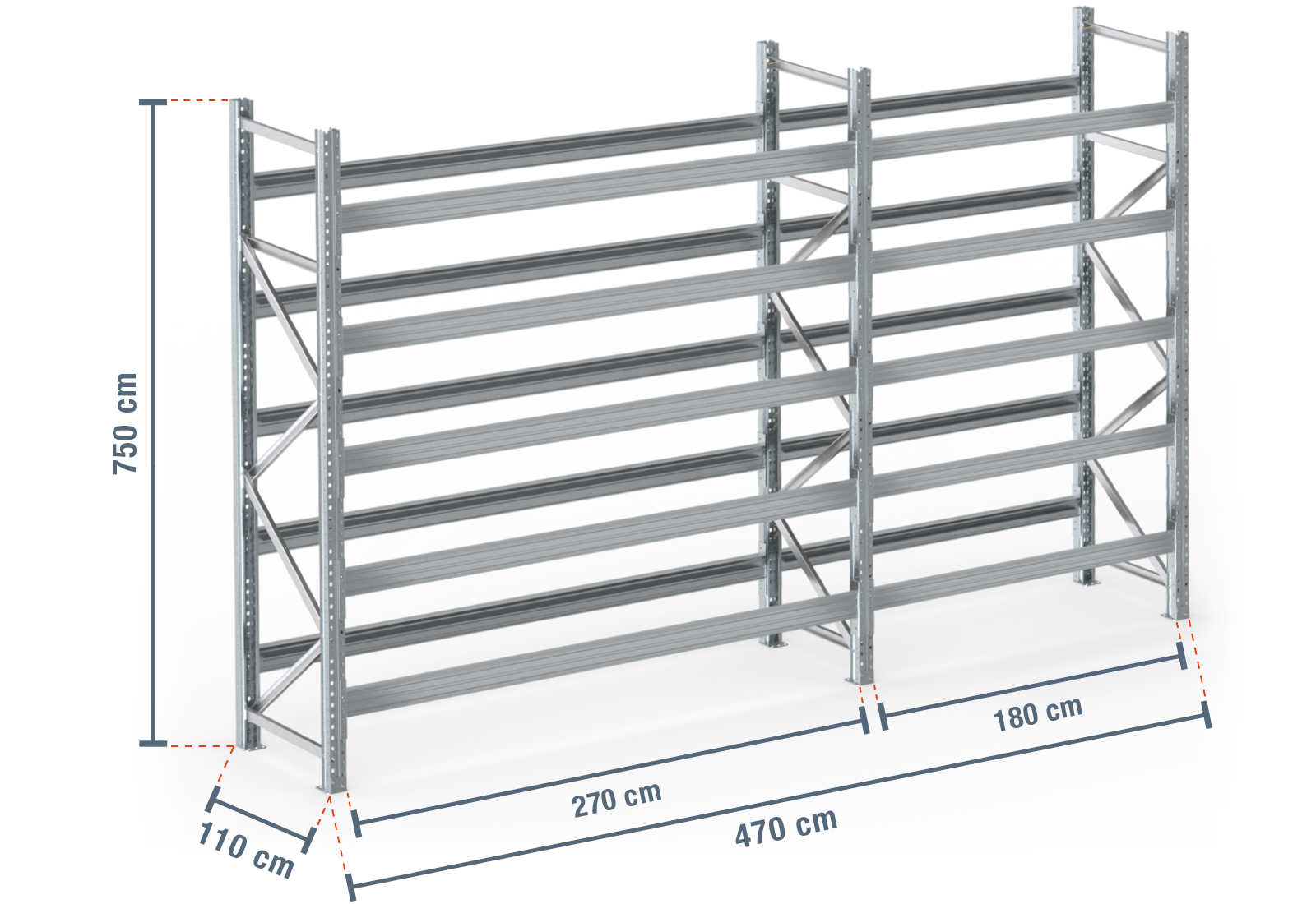 4,7 m estantería para palet PR9000F / 110 cm profundidad / 7,5 m altura / 5 estantes para 30 europalés