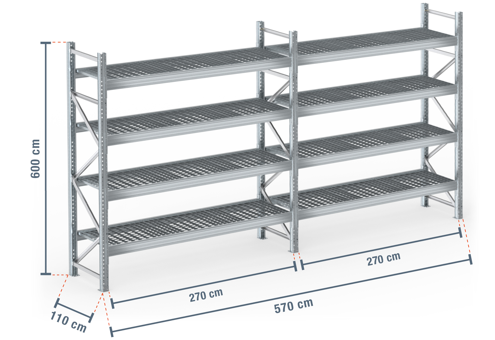 La superficie de esta estantería está galvanizada y, por lo tanto, es resistente a la intemperie. Esto la hace especialmente adecuada para su uso en exteriores, en cámaras frigoríficas, en entornos corrosivos o similares.