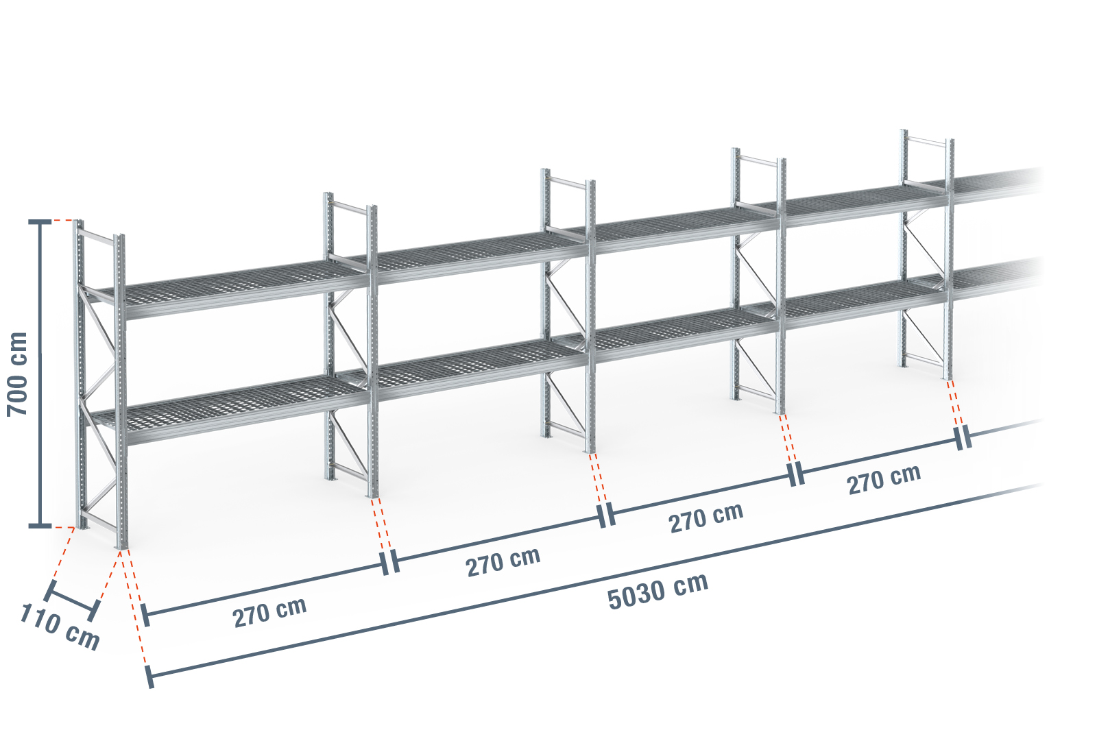 50,3 m estantería para palet PR9000F / 110 cm profundidad / 7 m altura / 2 niveles / baldas rejilla