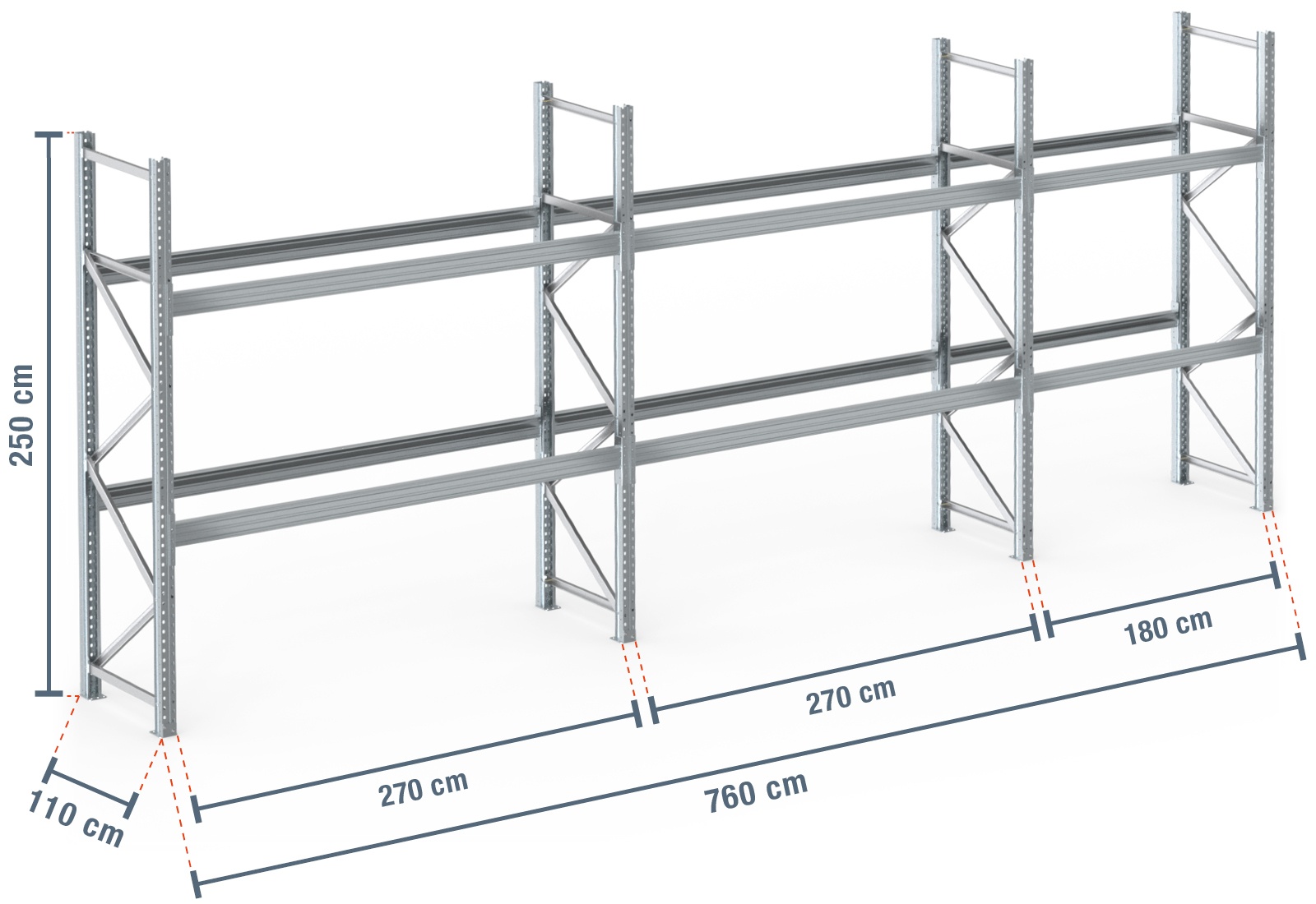 7,6 m estantería para palet PR9000F / 110 cm profundidad / 2,5 m altura / 2 estantes para 24 europalés