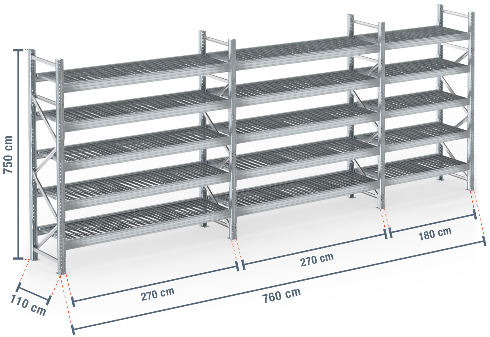 La superficie de esta estantería está galvanizada y, por lo tanto, es resistente a la intemperie. Esto la hace especialmente adecuada para su uso en exteriores, en cámaras frigoríficas, en entornos corrosivos o similares.