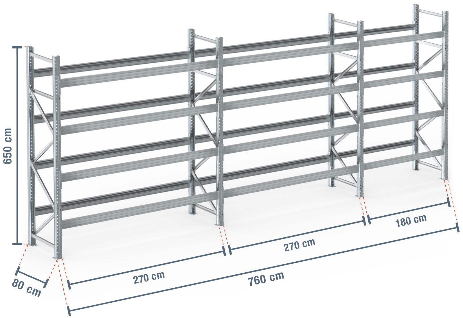 Ofrecemos las alturas comunes de 200 cm a 750 cm en pasos de 50 cm. Para las alturas individuales, los montantes de las estanterías se cortan a medida a petición o se fabrican individualmente según sus necesidades.