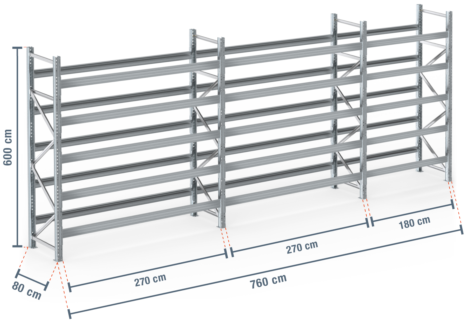 Los travesaños son galvanizados, por lo que son idóneos para su uso en exteriores. Simplemente se cuelgan en los soportes de la estantería mediante un diseño ensamblable. Los pasadores de seguridad adicionales evitan que el travesaño se levante accidentalmente y, por lo tanto, garantizan la seguridad. Los montantes de la estanteria para palet constan de dos perfiles verticales galvanizados. Los perfiles de soporte delantero y trasero se atornillan entre sí con la ayuda de puntales transversales y diagonales y, por lo tanto, permiten un nivel de estabilidad particularmente alto. Para garantizar aún más esto, se montan dos placas base por soporte de estantería en los extremos inferiores y se anclan firmemente al suelo con tornillos de anclaje. Como resultado, nuestras estanterias modulares para palets no solo son personalizables, sino también especialmente seguras gracias a su fijación en el terreno.