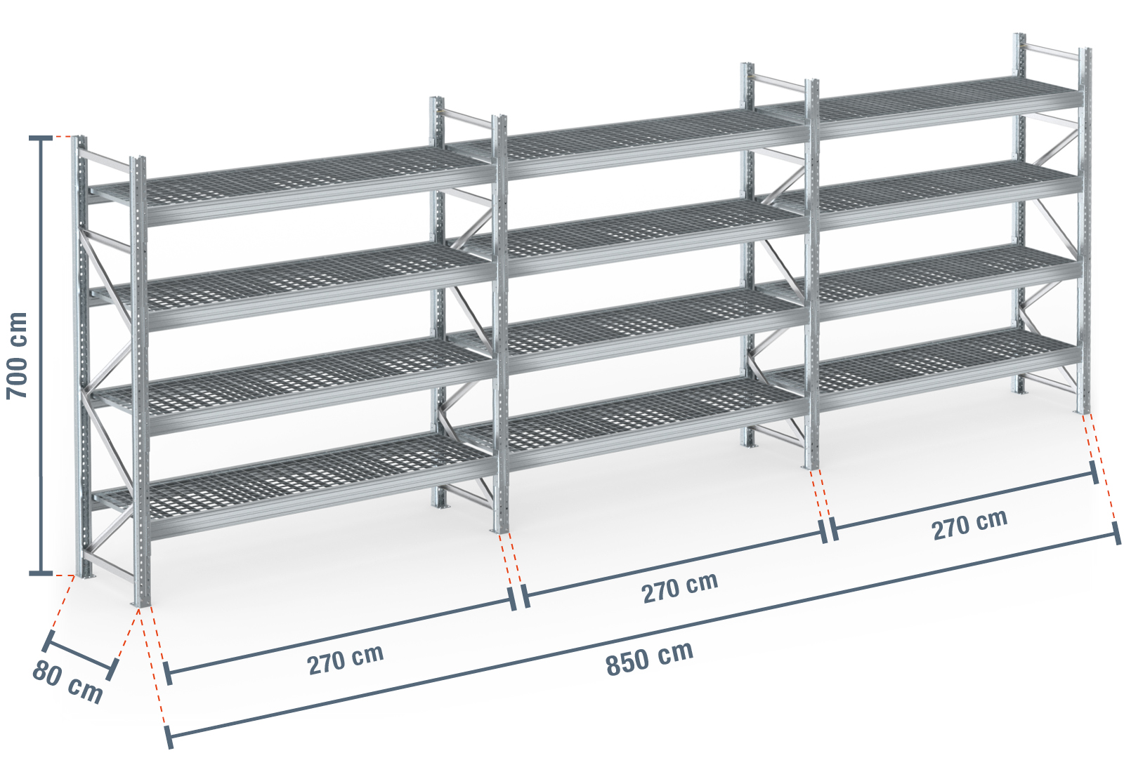 La superficie de esta estantería está galvanizada y, por lo tanto, es resistente a la intemperie. Esto la hace especialmente adecuada para su uso en exteriores, en cámaras frigoríficas, en entornos corrosivos o similares.