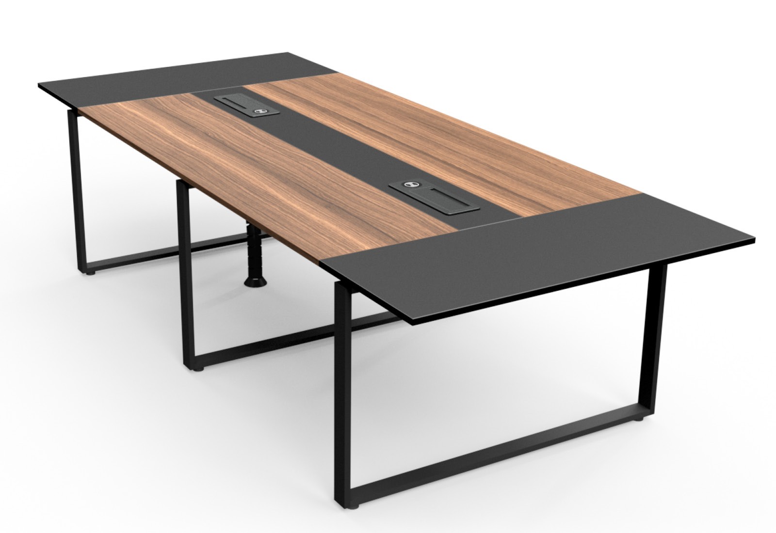La mesa de conferencia ANJA360i es de color gris y marrón nuez y resulta muy atractiva. La resistente superficie de la mesa se compone de tablas de madera revestidas de melamina con un grosor de 25 mm. Los tres marcos de deslizamiento de perfil de acero con revestimiento negro de 3 mm de grosor aportan un toque elegante y dan a la mesa de conferencias la estabilidad necesaria. Para esta mesa de reuniones utilizamos exclusivamente materiales de primera calidad, que garantizan una larga vida útil.