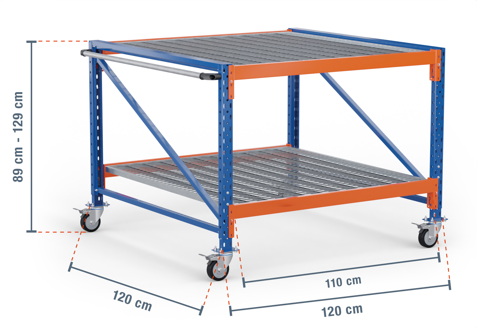 1,2 m mesa de trabajo con ruedas MFW1000-AT / 120 cm profundidad / 890 - 1.290 mm altura /2 niveles / baldas rejilla