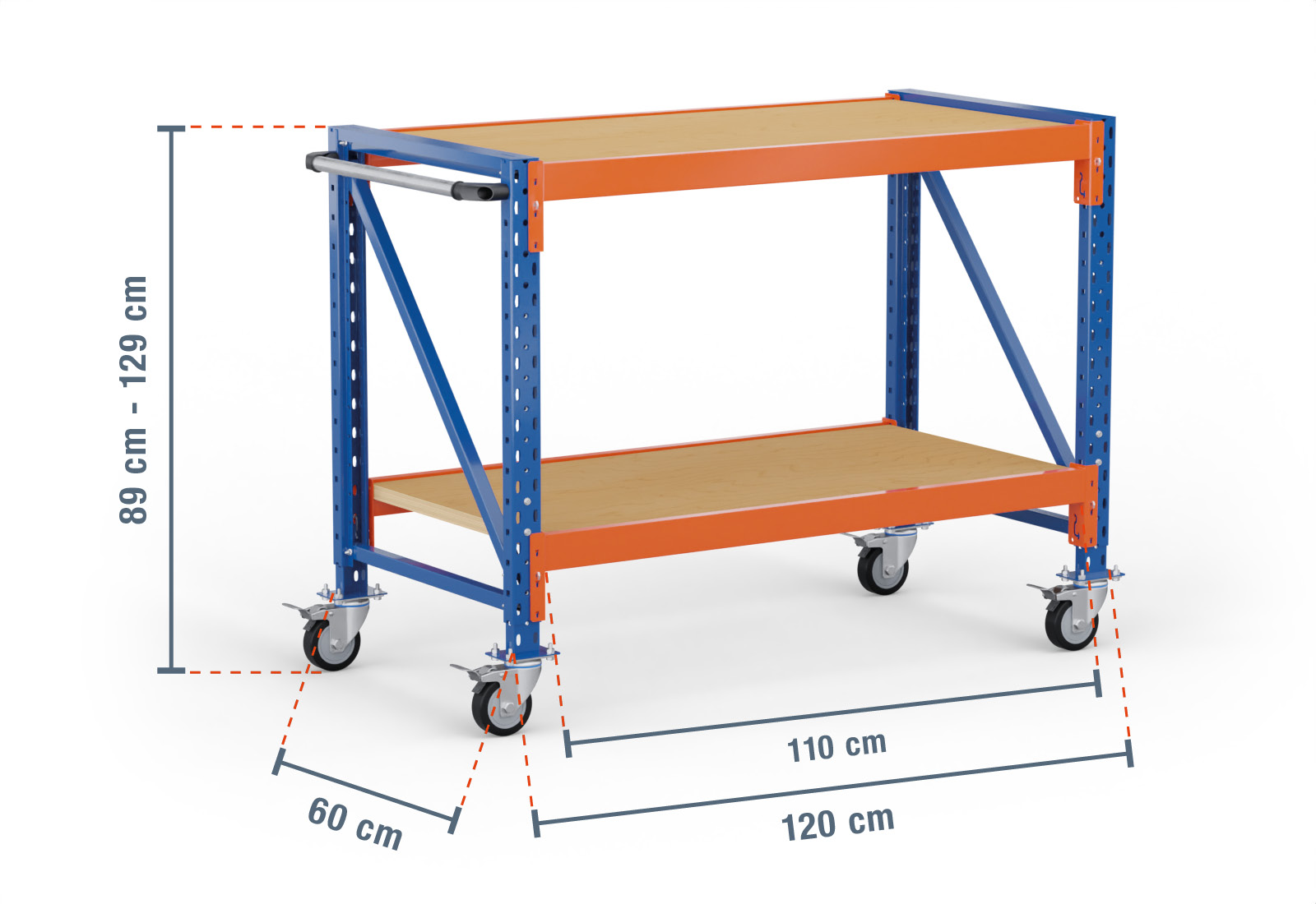 1,2 m mesa de trabajo con ruedas MFW1000-AT / 60 cm profundidad / 890 - 1.290 mm altura / 2 niveles / baldas madera contrachapada