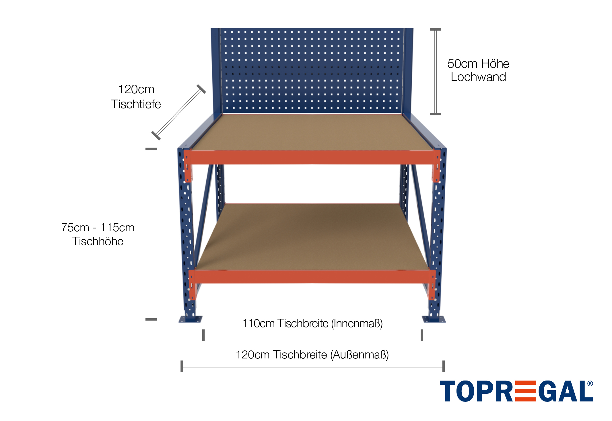 1,2 m mesa de trabajo mesa básica MFW1000-AT / 120 cm profundidad / 750 - 1.150 mm altura / 2 niveles / baldas/ madera / panel posterior perforado