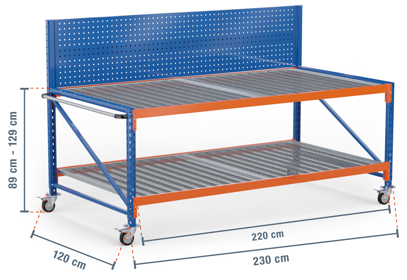 2,3 m mesa de trabajo con ruedas MFW1000-AT / 120 cm profundidad / 890 - 1.290 mm altura /2 niveles / baldas/ rejilla / panel posterior perforado