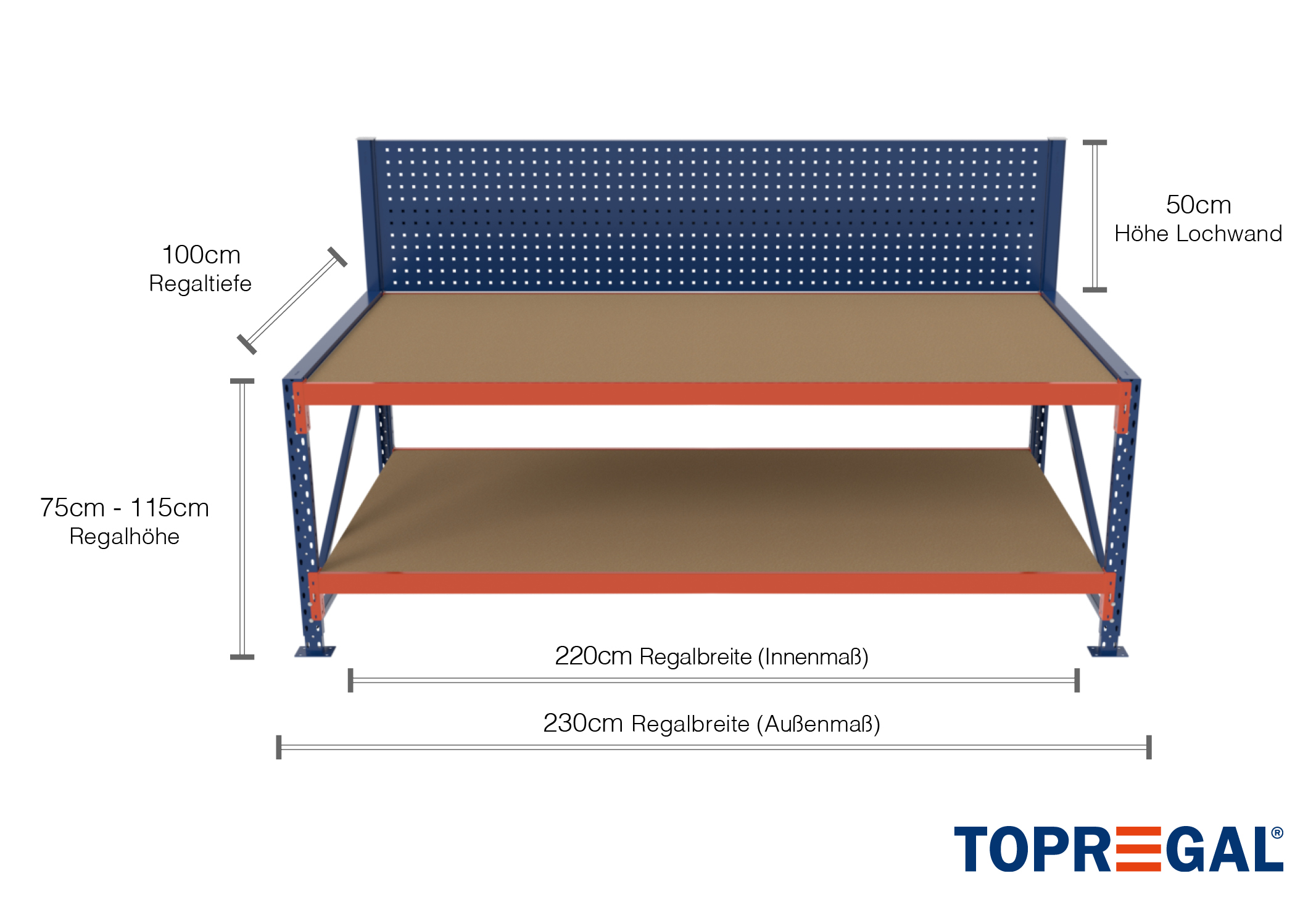 La dimensión exterior de esta mesa de trabajo es 2,3 m, mientras que la superficie útil de balda, la denominada dimensión interna, es 10 cm más corta. Los productos secos como tornillos, piezas de montaje y otros artículos se pueden almacenar aquí sin ningún problema.