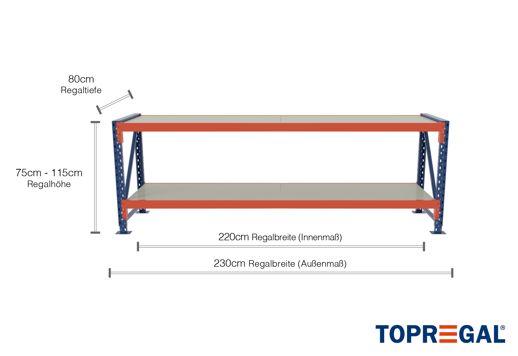 La dimensión exterior de esta mesa de trabajo es 2,3 m, mientras que la superficie útil de balda, la denominada dimensión interna, es 10 cm más corta. Los productos secos como tornillos, piezas de montaje y otros artículos se pueden almacenar aquí sin ningún problema.